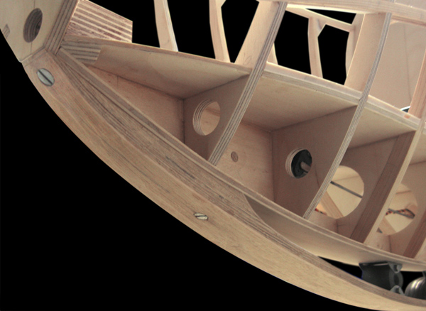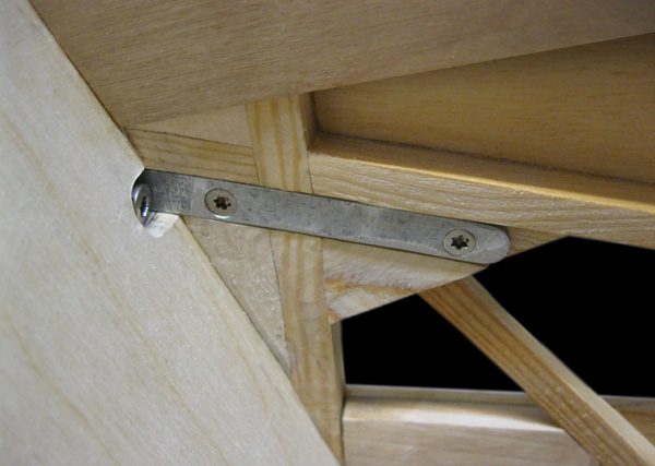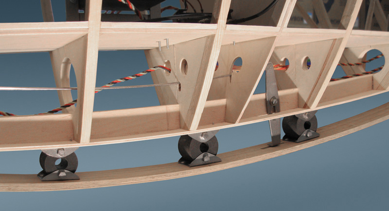 mit Ruderscharnieren Höhe 62cm. Spanten aus 1mm und Rippen aus 0,8mm Sperrholz, mit Kiefernleisten appliziert. Nase aus Balsaholz. Der Ruderspant ist mit einem 1,5mm Stahldraht gelagert, der durch ein Kunstoffröhrchen geführt wird. |