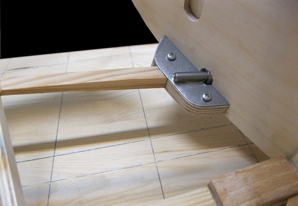 Verriegelung Der Mechanismus ist später nicht sichtbar, da er im Hohlraum der doppelwandigen Rumpfschale liegt. Nur ein kleiner Teil des abgewinkelten Stiftes ragt innen hervor. |