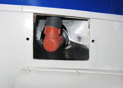 Deckel Er befindet sich auf der rechten Seite und ermöglicht den Zugang zum Tanknippel und dem Zündakku (hier noch nicht vorhanden). Außerdem werden hier die Flächenservos angeschlossen und der Füllstand des Tanks abgelesen. |